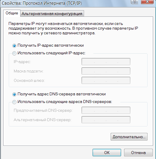 В окне "Свойства: Протокол Интернета (TCP/IP)" установите один флажок напротив надписи "Получить IP-адрес автоматически", другой - напротив надписи "Получить адрес DNS-сервера автоматически".